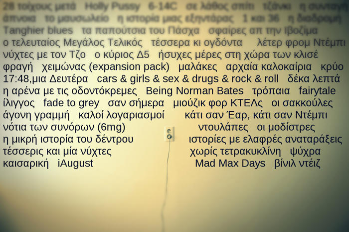 Ελπίζω να μην κόψαν πάλι το νερό. Κάθε απόγευμα η ίδια ιστορία. Ένας λαβωμένος σωλήνας φταίει, λένε. Αυτοί που δεν φτιάχνουν υπερσωλήνες φταίνε. Τι είναι οι σωλήνες; άνθρωποι είναι; Γαμώ τα νερά σας γαμώ. Πείτε μας τουλάχιστον να μάθουμε να ζούμε μόνο με τα δικά μας, να πλενόμαστε μ’ αυτά, μ’ αυτά να σφουγγαρίζουμε, αυτά να πίνουμε. Να μη σκουπιζόμαστε, να στραγγιζόμαστε. Πείτε το όμως.